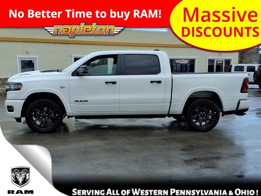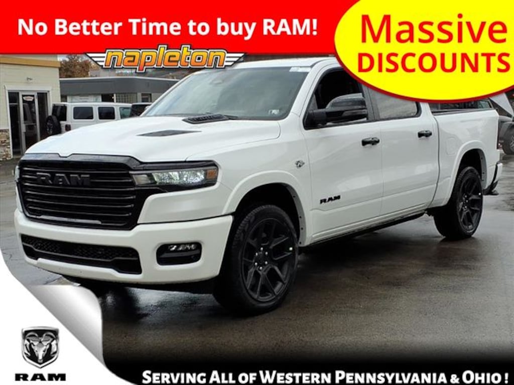 This 1500 is well equipped with Bed Utility Group (Exterior 115V AC Outlet, MOPAR 4 Adjustable Cargo Tie-Down Hooks, and MOPAR Spray in Bedliner), Laramie Level 2 Equipment Group (14.4" Touchscreen Display, 4G LTE Wi-Fi Hot Spot, Cluster 12" TFT Color Display, Connected Travel and Traffic Services, Connectivity - US/Canada, Front Passenger Interactive Display, GPS Navigation, Harman/Kardon 19 Speaker Premium Sound, Integrated Center Stack Radio, Integrated Voice Command with Bluetooth, Power Tailgate, Radio: Uconnect 5 Nav with 14.4" Display, Rain Sensitive Windshield Wipers, SiriusXM Radio Service, SiriusXM with 360L, and USB Host Flip), Night Edition (Accent Color Door Handles, Accent Color Premium Power Mirrors, Accent Color Tailgate Handle, Anti-Spin Differential Rear Axle, Auto Power-Folding Mirrors, Auto-Dimming Exterior Driver Mirror, Black Exterior Truck Badging, Black Headlamp Bezels, Black Interior Accents, Black Painted Exterior Mirrors Caps, Black Tail Lamp Bezels, Body Color Front Bumper, Body Color Rear Bumper with Step Pads, Convex Wide-Angle Exterior Mirror Insert, Dual Exhaust with Black Tips, Exterior Mirrors Approach Lamps, Exterior Mirrors Courtesy Lamps, Exterior Mirrors with Heating Element, Exterior Mirrors with Memory, Exterior Mirrors with Supplemental Signals, Grille Surround 3 Black Texture 2 Black, Pirelli Brand Tires, Proximity Approach/Departure Lamps, RAM Grille Badge - Black, Sport Performance Hood, and Wheels: 22" x 9" Forged Aluminum), Quick Order Package 27H Laramie, 10 Speakers, 33 Gallon Fuel Tank, 4-Wheel Disc Brakes, ABS brakes, Active Noise Control System, Adjustable pedals, Air Conditioning, Alloy wheels, AM/FM radio: SiriusXM with 360L, Apple CarPlay/Android Auto, Audio memory, Auto High-beam Headlights, Auto-dimming door mirrors, Auto-dimming Rear-View mirror, Automatic temperature control, Brake assist, Bumpers: chrome, Chrome Exterior Mirrors, Compass, Delay-off headlights, Dome Dual LED Reading Lamp, Driver door bin, Driver vanity mirror, Dual front impact airbags, Dual front side impact airbags, Dual-Pane Panoramic Sunroof, Electronic Stability Control, Front anti-roll bar, Front Bucket Seats, Front Center Armrest w/Storage, Front dual zone A/C, Front fog lights, Front reading lights, Front wheel independent suspension, Fully automatic headlights, Garage door transmitter, Heated door mirrors, Heated front seats, Heated rear seats, Heated steering wheel, Illuminated entry, Leather steering wheel, Leather Trimmed Bucket Seats, LED Dome/Reading Lamp, Low tire pressure warning, Memory seat, MOPAR Front and Rear Rubber Floor Mats, Navigation System, Occupant sensing airbag, Off-Road Information Pages, Outside temperature display, Overhead airbag, Overhead console, Panic alarm, ParkView Rear Back-Up Camera, Passenger door bin, Passenger vanity mirror, Pedal memory, Power Deployable Running Boards, Power door mirrors, Power driver seat, Power passenger seat, Power steering, Power windows, Radio data system, Radio: Uconnect 5 Navigation with 12.0" Display, RAM Grille Badge - Chrome, Rear anti-roll bar, Rear reading lights, Rear seat center armrest, Rear step bumper, Remote keyless entry, Security system, Speed control, Split folding rear seat, Steering wheel mounted audio controls, Tachometer, Telescoping steering wheel, Tilt steering wheel, Traction control, Trailer Brake Control, Trip computer, Turn signal indicator mirrors, Variably intermittent wipers, Ventilated front seats, Voltmeter, and Wheels: 20" x 9" Premium Paint/Polish. Price includes all guaranteed and qualifying incentives. See dealer for details.$1000 - 2026 National Bonus Cash . Exp. 03/31/2026 $2000 - 2026 National SFS Lease Loyalty Bonus Cash . Exp. 03/31/2026 $3500 - 2026 National Retail Bonus Cash . Exp. 03/31/2026