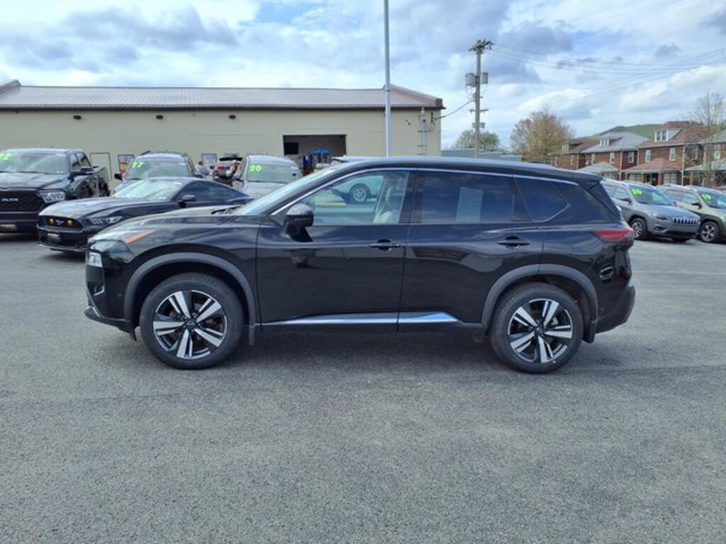 This Rogue is well equipped with SL Premium Package (Radio: AM/FM NissanConnect w/Navigation), 19" Aluminum Alloy Wheels, 4-Wheel Disc Brakes, 5.604 Axle Ratio, 6 Speakers, ABS brakes, Air Conditioning, Alloy wheels, AM/FM Radio, AM/FM radio: SiriusXM, Auto High-beam Headlights, Auto-dimming Rear-View mirror, Automatic temperature control, Black Splash Guards (Set of 4), Brake assist, Bumpers: body-color, Chrome Rear Bumper Protector, Delay-off headlights, Driver door bin, Driver vanity mirror, Dual front impact airbags, Dual front side impact airbags, Electronic Stability Control, Emergency communication system: NissanConnect Services, Floor Mats w/2-Piece Cargo Area Protector, Four wheel independent suspension, Front anti-roll bar, Front Bucket Seats, Front Center Armrest, Front dual zone A/C, Front reading lights, Fully automatic headlights, Heated door mirrors, Heated Front Bucket Seats, Heated front seats, Heated steering wheel, Illuminated entry, Knee airbag, Leather steering wheel, Leather-Appointed Seat Trim, Low tire pressure warning, Memory seat, NissanConnect featuring Apple CarPlay and Android Auto, Occupant sensing airbag, Outside temperature display, Overhead airbag, Overhead console, Panic alarm, Passenger door bin, Passenger vanity mirror, Power door mirrors, Power driver seat, Power Liftgate, Power moonroof, Power passenger seat, Power steering, Power windows, Radio data system, Rear anti-roll bar, Rear Parking Sensors, Rear reading lights, Rear seat center armrest, Rear side impact airbag, Rear window defroster, Rear window wiper, Remote keyless entry, Security system, Speed control, Speed-Sensitive Wipers, Split folding rear seat, Spoiler, Steering wheel mounted audio controls, Tachometer, Telescoping steering wheel, Tilt steering wheel, Traction control, Trip computer, Turn signal indicator mirrors, and Variably intermittent wipers.