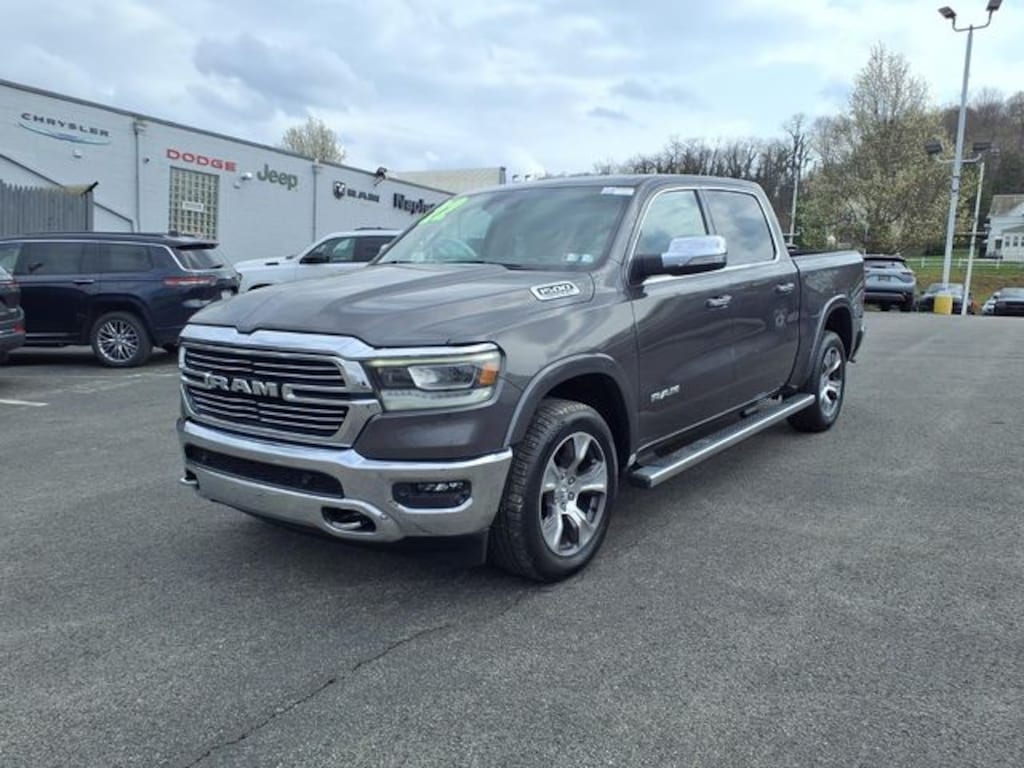 This 1500 is well equipped with Bed Utility Group (MOPAR 4 Adjustable Cargo Tie-Down Hooks and Pick-Up Box Lighting), Chrome Appearance Group (Bright Day Light Opening Moldings, Chrome Tow Hooks, and Wheel to Wheel Side Steps), Laramie Level B Equipment Group (DISC) (4G LTE Wi-Fi Hot Spot, 8.4" Touchscreen Display, All R1 High Radios, All Radio Equipped Vehicles, Apple CarPlay, Auto High Beam Headlamp Control, Connected Travel & Traffic Services, Connectivity - US/Canada, Disassociated Touchscreen Display, Foam Bottle Insert (Door Trim Panel), For Details, Visit DriveUconnect.com, For More Info, Call 800-643-2112, Global Telematics Box Module (TBM), Google Android Auto, GPS Antenna Input, GPS Navigation, HD Radio, Heated Second Row Seats, Integrated Center Stack Radio, Integrated Voice Command w/Bluetooth, ParkSense Front/Rear Park Assist w/Stop, Radio: Uconnect 5 Nav w/8.4" Display, Rain Sensitive Windshield Wipers, Rear 60/40 Folding Split Recline Seat, Remote Tailgate Release, SiriusXM Radio Service, SiriusXM w/360L, and USB Host Flip), Quick Order Package 25H Laramie, Trailer Tow Group (Trailer Brake Control, Trailer Light Check, and Trailer Tire Pressure Monitoring System), #1 Seat Foam Cushion, 10 Speakers, 2nd Row In Floor Storage Bins, 3 Rear Seat Head Restraints, 4 Way Front Headrests, 4-Wheel Disc Brakes, 48V Belt Starter Generator, ABS brakes, Adjustable pedals, Air Conditioning, Alloy wheels, AM/FM radio: SiriusXM, Apple CarPlay/Android Auto, Audio memory, Auto-dimming door mirrors, Auto-Dimming Exterior Driver Mirror, Auto-dimming Rear-View mirror, Automatic temperature control, Brake assist, Bumpers: chrome, Chrome Exterior Mirrors, Compass, Convex Wide-Angle Mirror Insert, Delay-off headlights, Dome Dual LED Reading Lamp, Driver door bin, Driver Seat Memory, Driver vanity mirror, Dual front impact airbags, Dual front side impact airbags, Dual-Pane Panoramic Sunroof, Electronic Stability Control, Exterior Mirrors Courtesy Lamps, Exterior Mirrors w/Heating Element, Exterior Mirrors w/Memory, Exterior Mirrors w/Supplemental Signals, Front anti-roll bar, Front Center Armrest w/Storage, Front dual zone A/C, Front fog lights, Front reading lights, Front Seat Back Map Pockets, Front wheel independent suspension, Fully automatic headlights, Garage door transmitter, Heated door mirrors, Heated Front Seats, Heated front seats, Heated Steering Wheel, Heated steering wheel, Heavy-Duty Engine Cooling, Illuminated entry, Leather steering wheel, Leather Trim 40/20/40 Bench Seat, LED Dome/Reading Lamp, Low tire pressure warning, Manufacturer's Statement of Origin, Memory seat, MOPAR Front & Rear Rubber Floor Mats, Occupant sensing airbag, Outside temperature display, Overhead airbag, Overhead console, Panic alarm, ParkView Rear Back-Up Camera, Passenger door bin, Passenger vanity mirror, Pedal memory, Power 2-Way Driver Lumbar Adjust, Power 2-Way Passenger Lumbar Adjust, Power 8-Way Driver & Passenger Seats, Power door mirrors, Power driver seat, Power passenger seat, Power steering, Power windows, Power-Folding Mirrors, Radio data system, Radio: Uconnect 5 W w/8.4" Display, Rear 60/40 Folding Seat, Rear anti-roll bar, Rear seat center armrest, Rear step bumper, Rear Underseat Compartment Storage (DISC), Rear Wheelhouse Liners, Rear window defroster, Remote keyless entry, Security system, Speed control, Split folding rear seat, Steering wheel mounted audio controls, Tachometer, Telescoping steering wheel, Tilt steering wheel, Traction control, Trip computer, Turn signal indicator mirrors, Variably intermittent wipers, Ventilated Front Seats, Ventilated front seats, Voltmeter, Wheels: 18" x 8" Aluminum Base Painted, and Wheels: 20" x 9" Premium Paint/Polished.